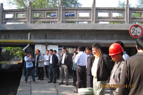 2012年 10月19日下午,绍兴市直部分人大代表视察内河清淤工程情况,市领导傅祖民、徐挺富、市老领导陈章方、黄秋芳等领导在旅游集团董事长沈安龙、内河公司总经理张永茂的陪同下来到下大路清淤现场,对清淤工作进行视察指导。