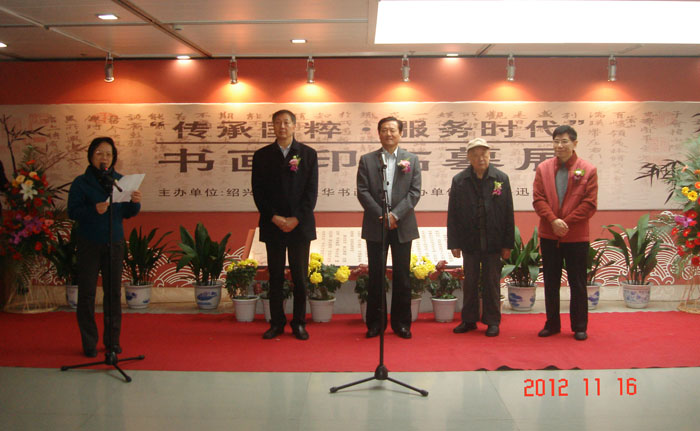 为庆祝党的十八大胜利闭幕和纪念毛泽东主席《在延安文艺座谈会上的讲话》发表七十周年,由绍兴市政协墨华书画院主办,绍兴鲁迅纪念馆协办的“传承国粹服务时代”——书画印临摹展于11月16日上午,在绍兴鲁迅纪念馆隆重开幕。省政协科技教育委员会副主任顾秋麟,市政协副主席陈伯怀,市老领导陆景林、李露儿和我市著名书法家沈定庵出席开幕式。此次展览共展出80余幅优秀临摹作品。其中既有老一辈书画家的精品力作,又有中青年中坚力量的扛鼎之作,更有市老领导的新品佳作,可谓新老名家咸集,丹青妙笔竞技。展出的作品,篆行隶楷,众体纷呈;书画篆刻,诸艺毕陈。精彩纷呈,惟妙惟肖。内容与形式完美结合,书法与绘画相得益彰。