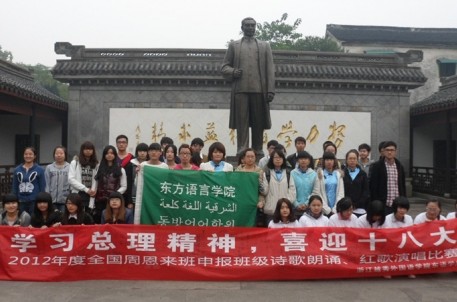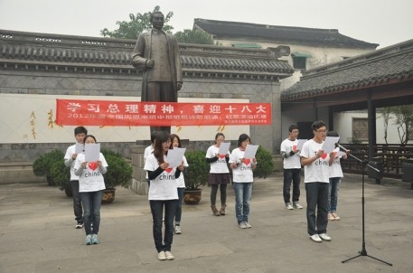 11月8日下午,“学习总理精神,庆祝十八大胜利召开”绍兴越秀外国语学院东语学院2012年度全国周恩来班申报班级诗歌朗诵、红歌演唱比赛在周恩来纪念广场举行。 在党的十八大胜利召开之际,学校举行此次活动,不但集中展示了东语学子的精神风貌和文化修养,同时也激发了学生的积极性,进一步明确“为中华之崛起而读书”的责任感和使命感。(名人故居 李娜)