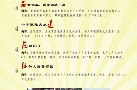 黄酒城古越龙山酒楼重新装修后正式开业,凡在活动期间到古越龙山酒楼享用黄酒宴的客人,都将获赠黄酒城门票一张(10张/桌)。
