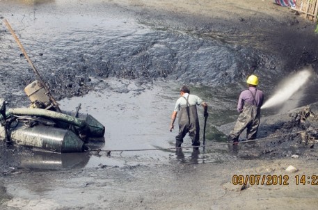 工程按市区内河水系划分河道先后顺序开展清淤,做到河道清淤后及时翻水,减少对周围居民的影响。同时,为避免淤泥对河岸造成二次污染,工程采取了“筑坝抽水、高压冲泥、泵提泥浆、船舶外运”的方法,即用高压水泵将淤泥从河床底部冲刷起,再用泥浆泵抽送至船舶上,后由运泥船直接运载至淤泥处置地倾倒。在清淤现场,当河道内的水抽干时,发现河床两边淤泥堆积十分严重,如缪家桥河、汲水弄河基本深度在0.5—0.8米之间,个别河段如望花河淤泥厚达2米。