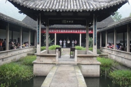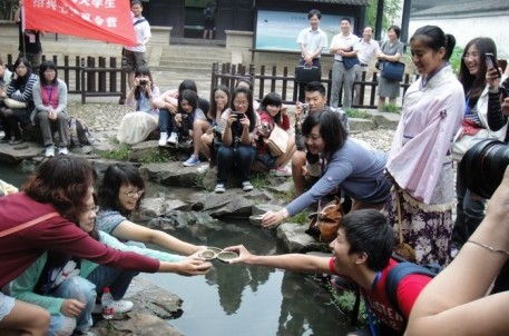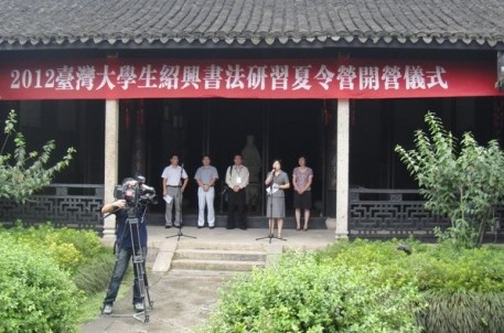 8月23日上午,2012年台湾大学生绍兴市书法研习夏令营在兰亭景区王右军祠开营。参加开营仪式的有国台办、省台办、市台办、兰亭书法学院领导和来台湾大学生、绍兴文理学院大学生等。在开营仪式上,市台办领导致欢迎词,书法学院领导授夏令营营旗,学生代表讲话。开营仪式结束后,台湾大学生饶有兴趣的参加了景区为其精心准备的曲水流觞和临池十八缸学书活动。在曲水流觞处,两岸学子纷纷饮酒作诗、唱歌,气氛活跃,充分展示了当代大学生多才多艺的风采。在临池十八缸处,学生们拿起毛笔金砖习字,领悟“吾儿练尽三缸水,唯有一点像羲之”的典故内涵。