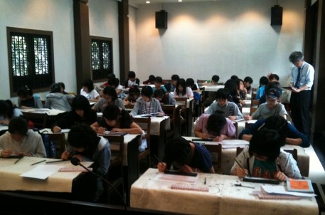 5月23日下午,由中国旅行社组织的上海日本人学校组织了二百多名初一学生来书法圣地兰亭参观,学习书法,感受中国的传统艺术。学生们参观完景点后,分批来到景区报告厅听书法老师讲课,并在老师指导下,学习制作文镇,学写毛笔字,部分书法基础较好的学生还在王右军祠进行了扇面书法学习和创作。