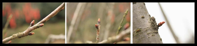 嫩红色的小芽在雨水的滋润下陆陆续续的从树枝间抽出来了,让我们欣喜万分。