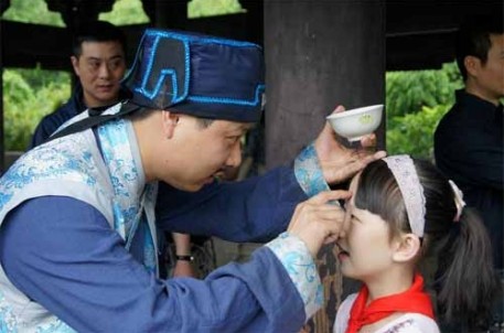 诗会同一天,沈园老管家在孤鹤轩用雄黄酒在小孩子脑门上写“王”字。端午节用雄黄酒在小孩子脑门上写“王”字,可以起到辟邪的作用,当然这也是寄托了大人们对孩子的希望。景区的这一活动,受到了游客的欢迎。