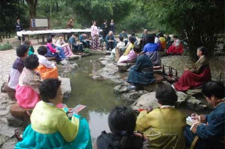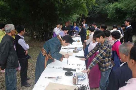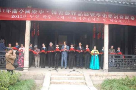 10月27日下午,由中国兰亭书会、韩国世宗韩文书法协会共同主办,兰亭景区承办的2011兰亭中韩国际书艺展暨学术研讨会在我景区举行。来自中韩的40多书法家和书法爱好者、新闻媒体一起参加了开幕式,年近九旬的绍兴著名老书法家郭子美也应邀出席。开幕式上,兰亭书会会长谢有才、世宗韩文书协会长朴炳千分别致欢迎词,并互赠了书法文献资料。期间,还进行了隆重的剪彩仪式。开幕式后,中韩书家身着各自的特色服装列坐曲水,效仿先贤,流觞雅集,饮酒赋诗,以书会友。最后,书法家们参加了中韩学术研讨会,喻革良(中)、崔英姬(韩)等多位书家代表发表了自己的学术观点和研究成果。