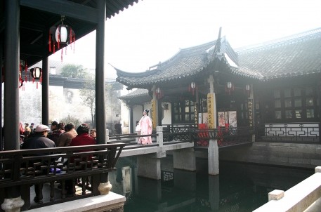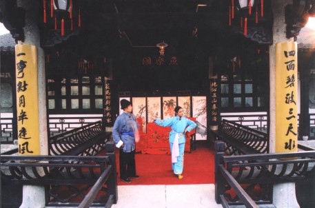 台门社戏, 鲁迅笔下风情园在绍兴鲁迅纪念馆西北侧,有一朱家台门,又称“老磐庐”,它西接周家新台门,东邻周家老台门,北临东咸欢河。朱家台门环境幽雅,且寓古迹,为古城绍兴保存最完整的典型的花园台门建筑。朱家台门的主人叫朱阆仙,即买下周家新台门的“朱文公的子孙”。朱家台门原为越王望花宫故址,系明初名将胡大海官宅的一部分。