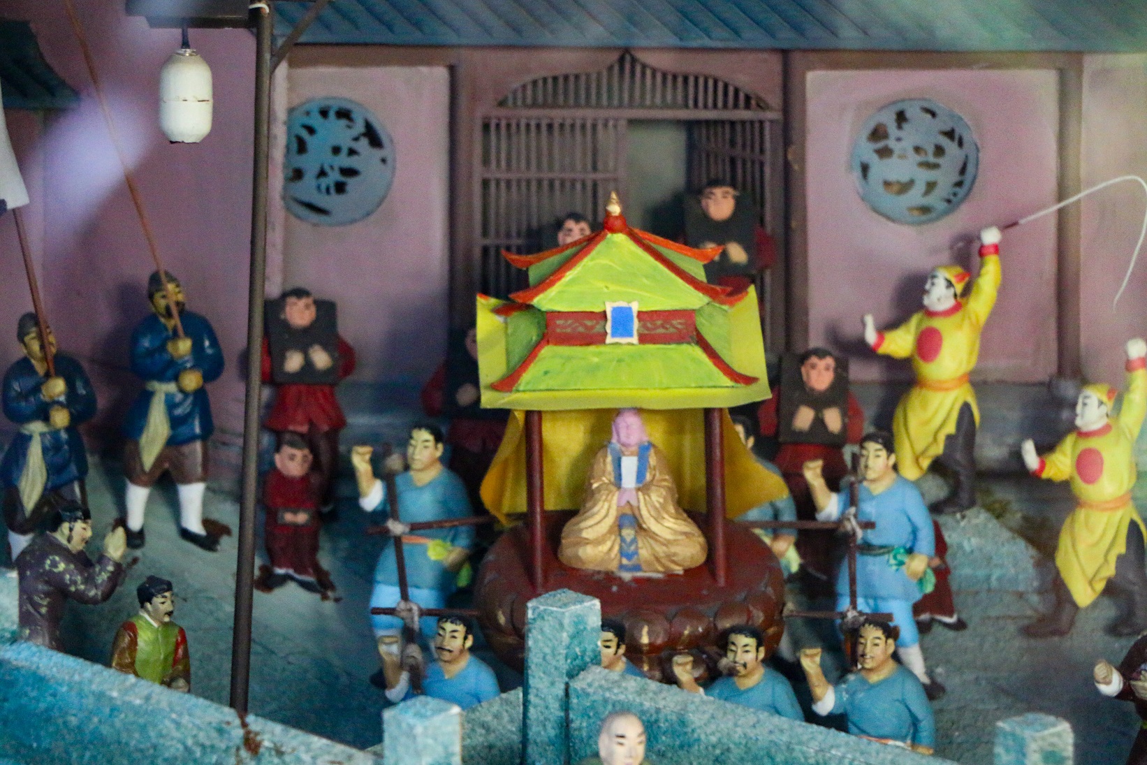 第三进为“迎神赛会”。主要用大型微缩景观的展示方式配以简明的历史渊源说明,在有限的空间里尽量地展现“迎神赛会”的壮观场面:游行队伍正在抬神巡行,鸣锣喝道,火铳震天。有舞狮、舞龙的,踩高跷、调无常的,人山人海,热闹非凡。人们驻足观望,街上店铺林立,远处几座大山隐约在望,近处河上还嬉戏着几只白鹅。