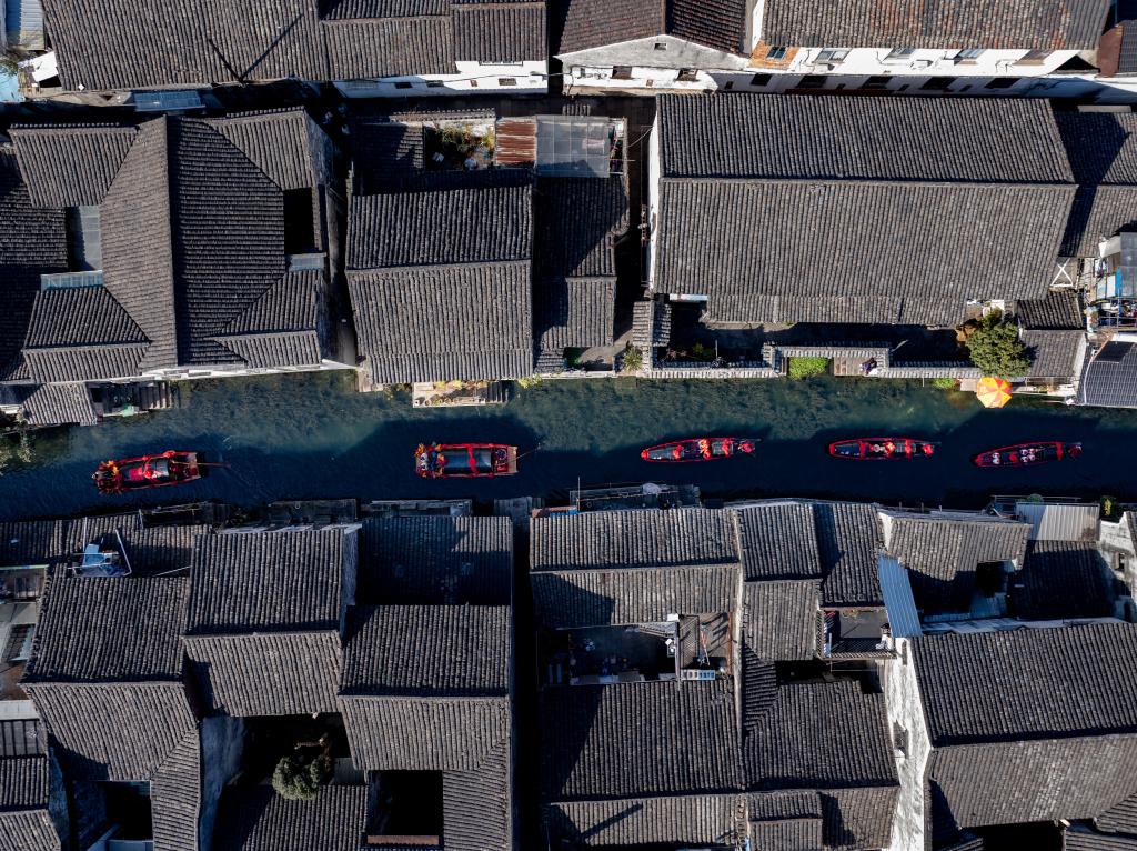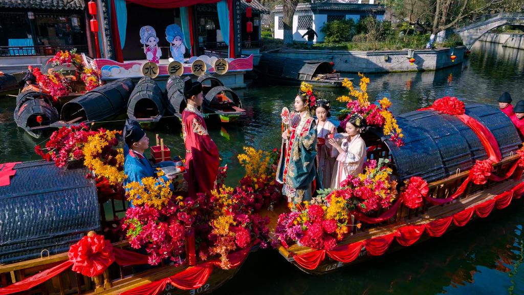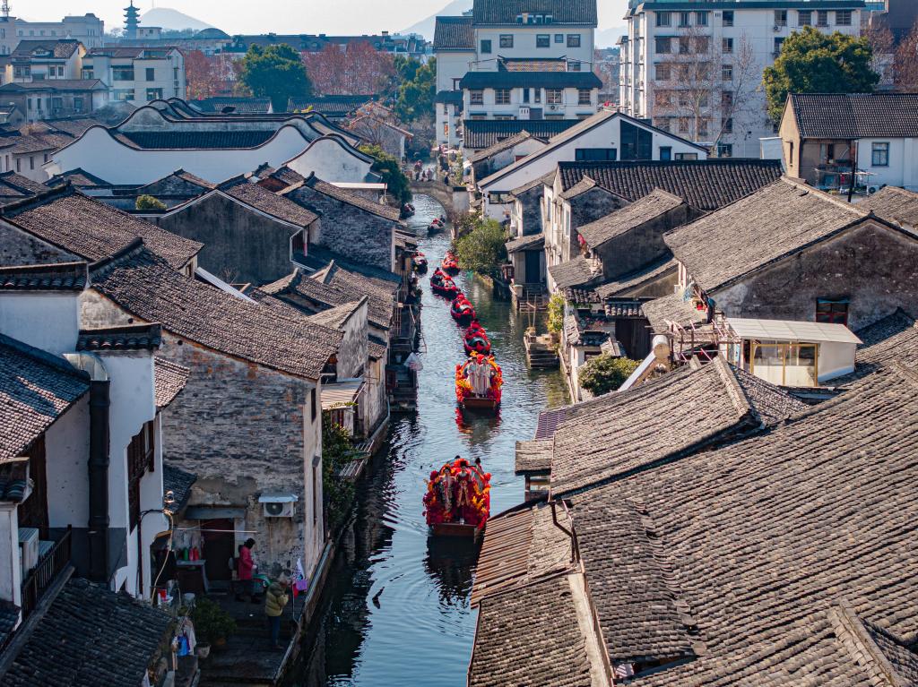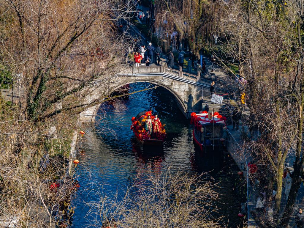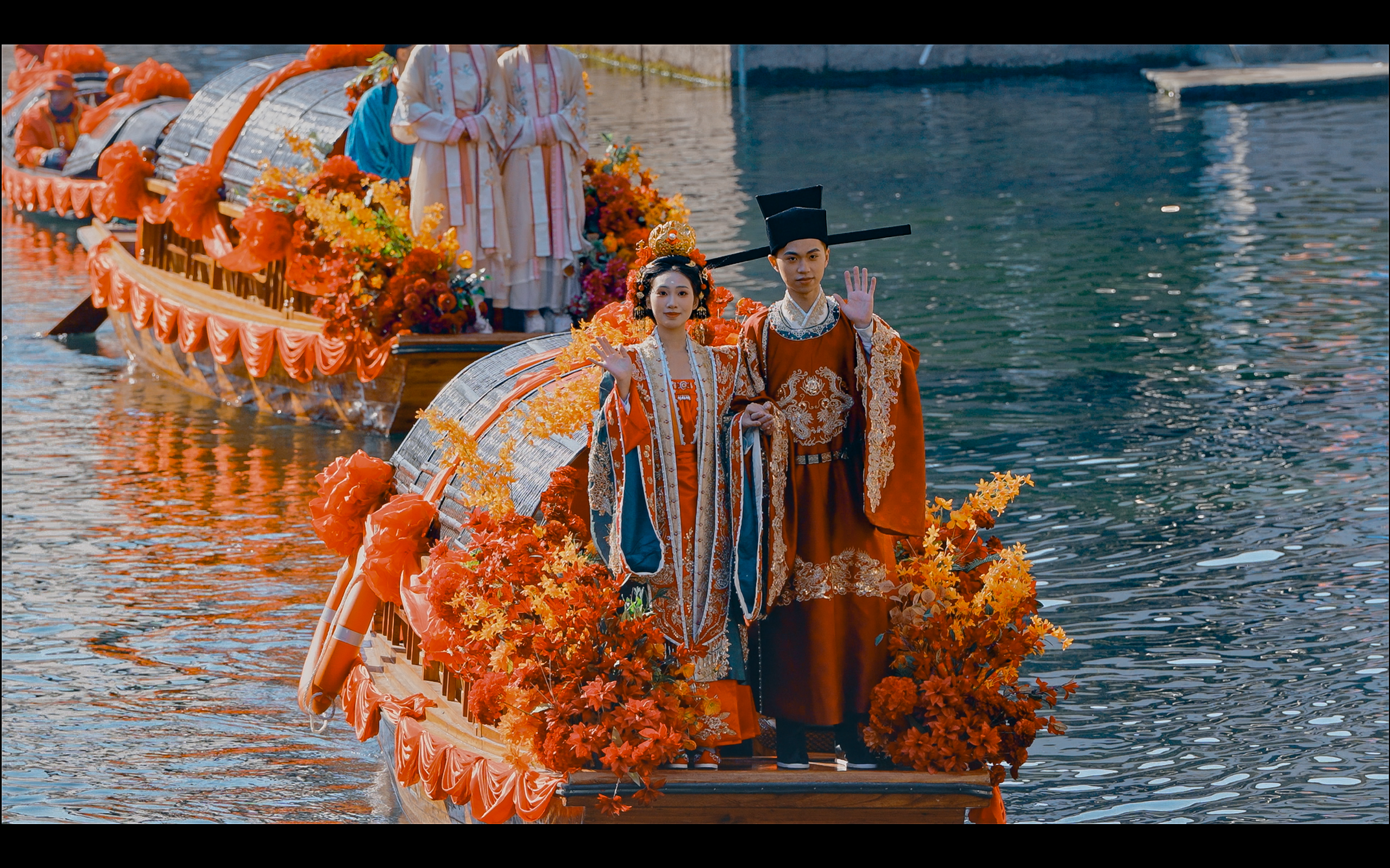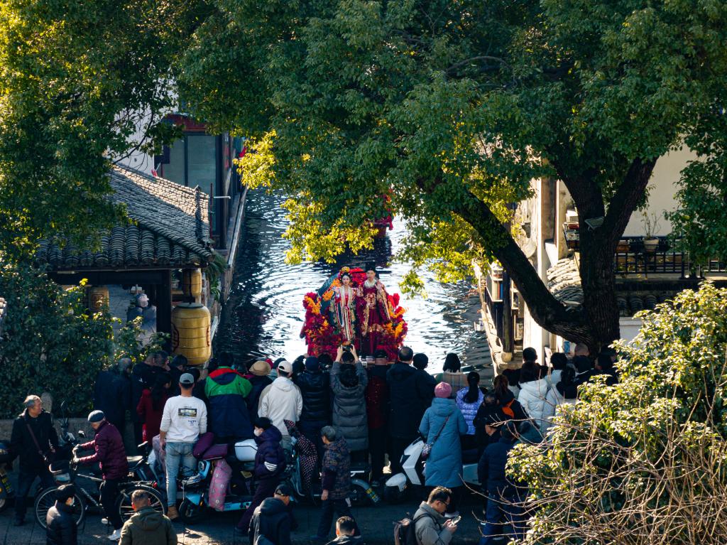 在城市广场水域,开启一场老绍兴水上迎亲巡游,伴随着热闹的锣鼓、喜庆的唢呐,新人携手一起跨火盆、过马鞍、挑盖头、拜天地、许誓言,向大家分撒喜糖。在鼓乐声中,一对新人坐着乌篷水上巡游,将浪漫演绎到极致。围观群众可以加入迎亲的船队,沾沾新人喜气。新人在众人的祝福中完成一场传统水上婚礼,携手开启幸福人生。