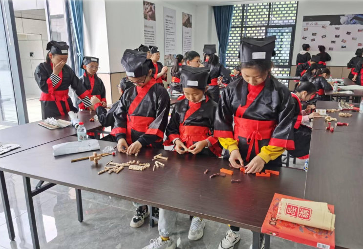 兰亭研学营地教学以“传承 + 创新”为理念,课程体系以“书法文化为代表,传统国学为依托,生活创新为特色,按照传统国学类,手工制作类,艺术修养类,户外拓展类,生命健康类等五大类设计课程共计30余门,其中曲水流觞、扇面描红、石刻拓碑、活字印刷、木刻版画、书贴临摹等成为最受欢迎的主题课程。我们将腾飞的翅膀与流畅书法笔划相融合的“之”字成为兰亭研学营地IP符号,表达了文化自信、积极向上、健康阳光的设计理念,立志打造成全国一流的国家级中小学生研学实践教育营地。