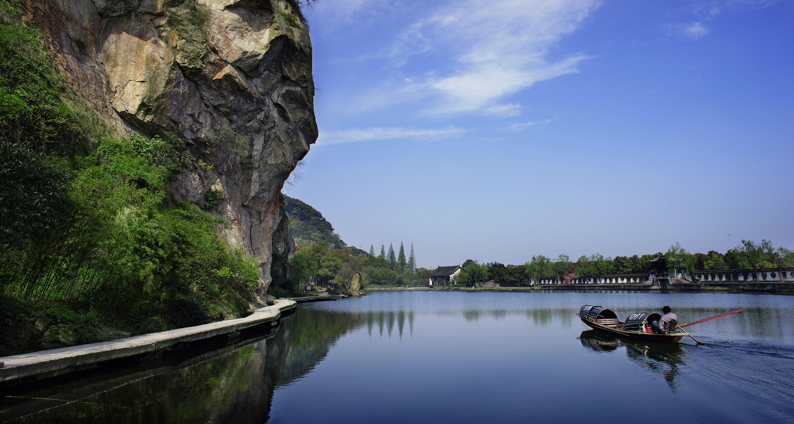 东湖,位于绍兴城东5公里处,原为一座青石山,自汉代起石工相继至此凿山取石,经过千百年的凿穿斧削,遂成悬崖峭壁,奇潭深渊。清光绪二十二年(1896年),陶渊明第45代孙,晚清著名书法家、教育家、园林艺术家——陶濬宣耗资8000银元购得此地,以《桃花源记》为范本,精心布局园内的亭、台、楼、阁,与崖壁、岩洞、石桥、湖面巧妙结合,历时三年细致打磨,于1899年建成了美妙绝伦的东湖。