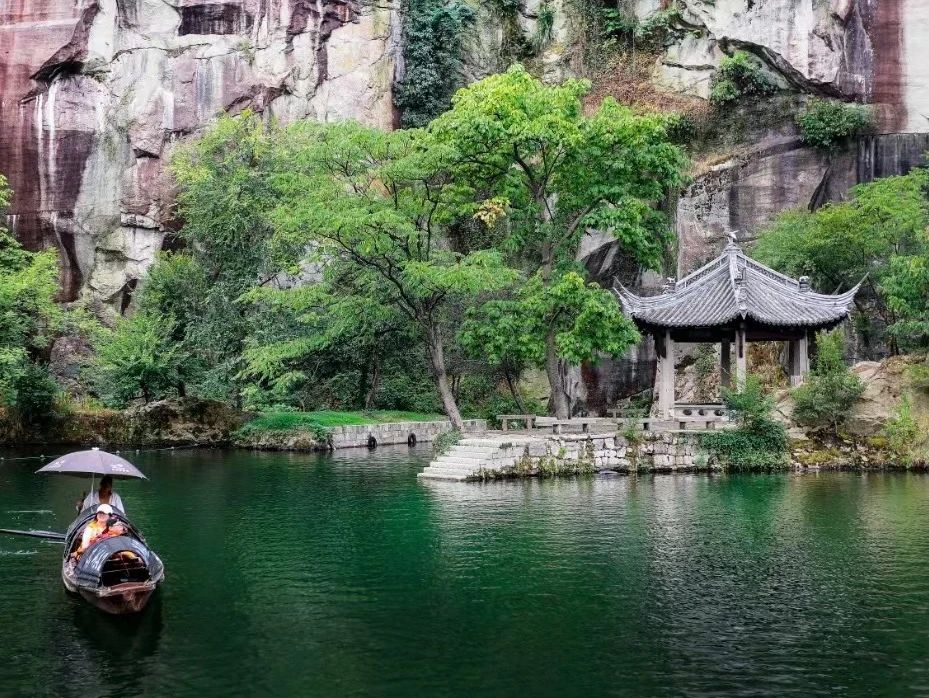 行至陶园最东处,便能看见象征春天的“听湫亭”了,此亭建于清末,与社戏台“扬帆舫”隔水相望。游人于春风拂面中驻足亭内,即可听得陶公洞内崖壁上水珠入潭的清脆声音,如龙湫入水,故取名“听湫亭”。