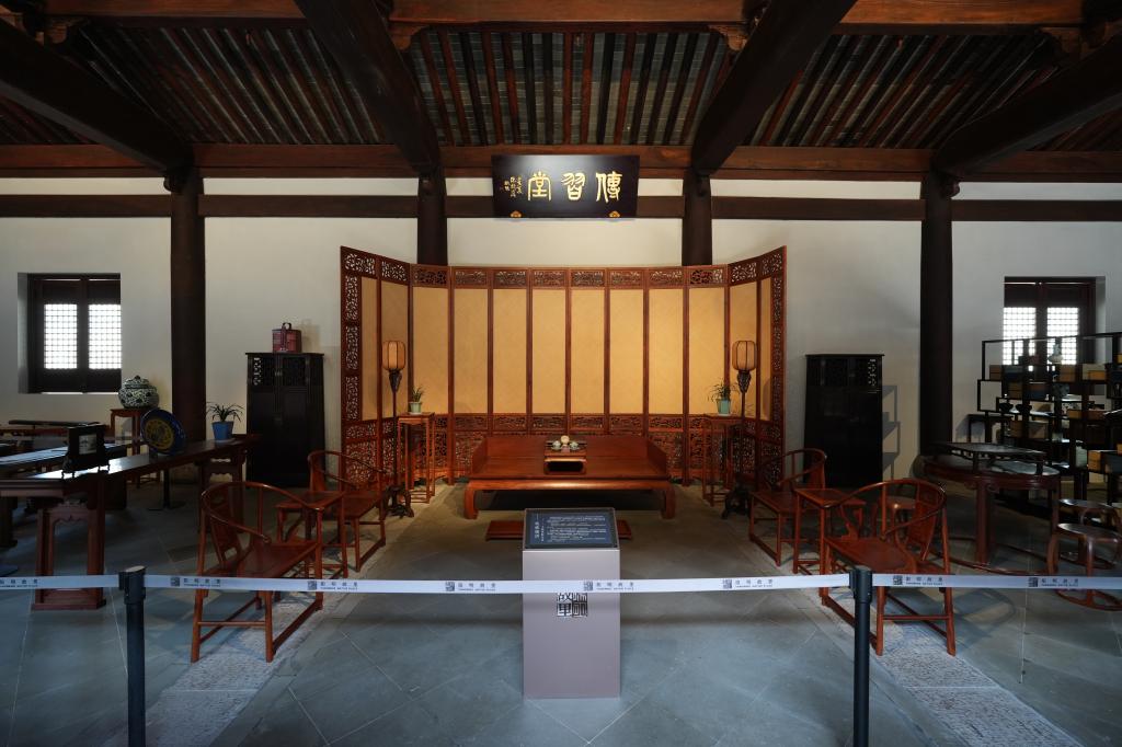 传习堂是王阳明故居的第四进辅房。堂前悬挂两副楹联:前方为陆九渊诗句“讲习岂无乐,钻磨未有涯”,后方为王阳明《夜坐》诗联“千圣本无心外诀,六经须拂镜中尘”。堂内还原明代文人生活场景,从左往右分设四句教抄写体验区、琴房、会客厅和书房。琴房象征王阳明以古琴抒怀;会客厅体现其与友人讲学论道;书房则展示其书法造诣。徐渭曾评:“王羲之以书掩其人,阳明先生以人掩其书”,意指王阳明书法境界不逊王羲之,但因心学成就过高,书法反被忽视。