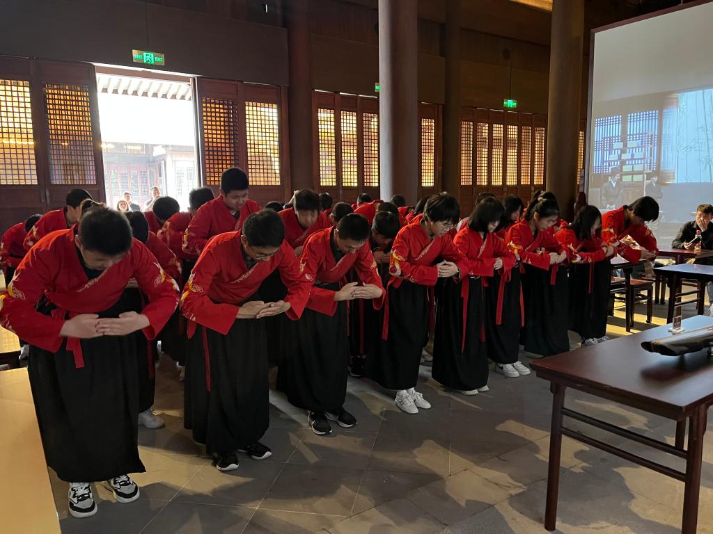 3.在指导老师带领下学习拜师礼仪,并向王阳明像行拜师礼。
