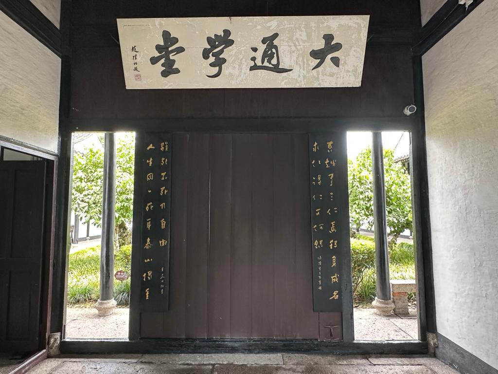 台门斗位于大通学堂中轴线第一进,正上方悬挂的这块“大通学堂”匾额是由前佛教协会会长赵朴初先生所题,两侧的楹联分别是:吾越有三仁焉,杀身成名,求仁得仁又何怨;人生同一死耳,泰山独重,虽死不死乃自由。这是由陶成章族叔陶浚宣所写,体现出当时光复会三位绍兴籍领袖徐锡麟、秋瑾、陶成章对革命抱着视死如归的精神。