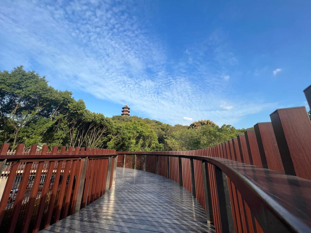 蕺山栈道连接古城北入口文化公园游步道和蕺山山体,总长约170米,平均高度约8米,步道宽2.3米。通过旋梯下连古色古香的游步道,上通“S”形廊桥,直达蕺山之巅—文笔塔。登塔俯瞰栈道,只见栈道隐掩于绿荫之中,宛若游龙,古朴的木色栈道与古色古香的游步道相连,旁边层楼叠榭,气韵流畅。当夜幕降临,灯光点缀,悠悠古韵与绿色生态相融,成为绍兴城市夜晚最美的风景。