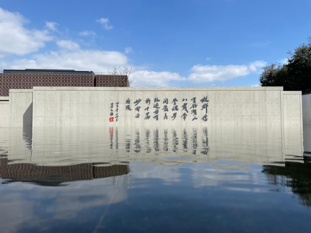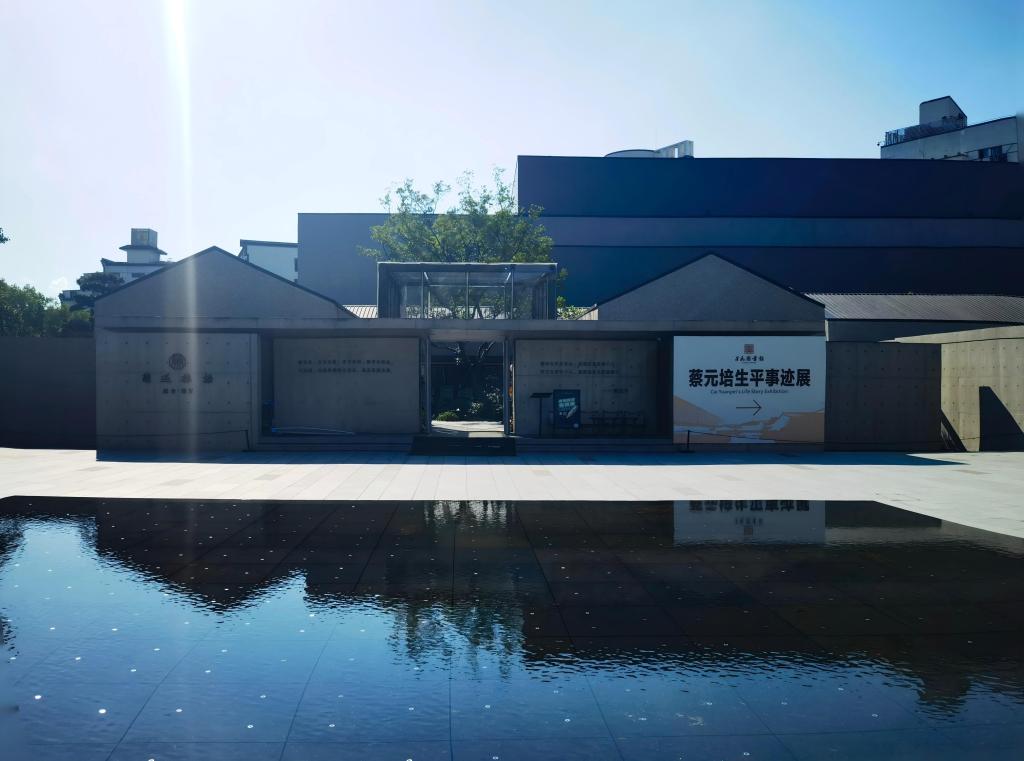 孑民图书馆前的照壁以青灰色石材打造,古朴典雅,正中镌刻着蔡元培先生手书诗作:“故乡尽有好湖山,八载常萦魂梦间。 最羡卧游君有术,十篇妙绘若循环。