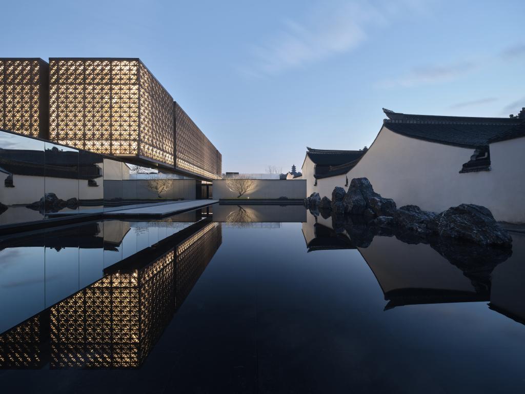 图书馆东侧与蔡元培故居通过一处水景相映成趣,形成独特的空间对话。水池一侧完整保留了蔡元培故居优美的山墙轮廓线,展现了明清台门建筑的传统韵味;另一侧则是以现代建筑语言打造的图书馆玻璃幕墙。设计师巧妙地运用高反射单向镜面玻璃,使新建建筑的外立面既映照出传统建筑的风貌,又呈现出自身的现代肌理。这种匠心独运的设计,完美诠释了传统与现代、过去与当下的时空对话与艺术碰撞