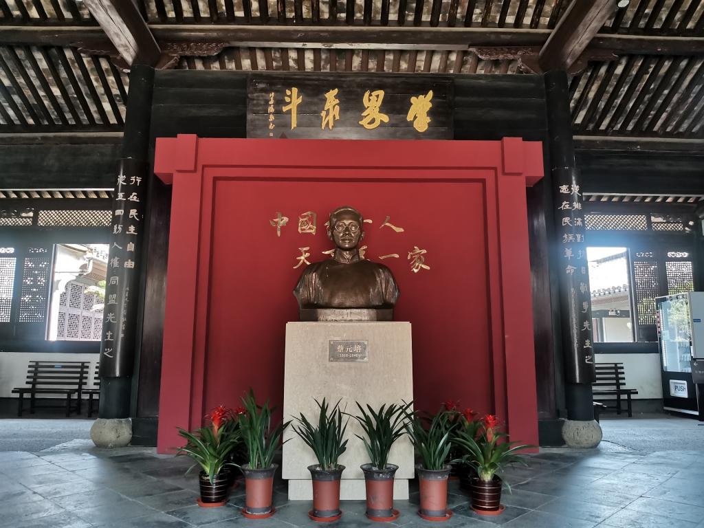 大厅内安放着蔡元培半身塑像,目光和蔼睿智,一派长者风范。大厅上方悬挂毛泽东褒誉先生“学界泰斗”匾额和周恩来撰、沈定庵书挽联:“从排满到抗日战争,先生之志在民族革命;从五四到人权同盟,先生之行在民主自由。”通过塑像的“形”、匾联的“文”与空间的“境”,将先生的人格魅力、历史贡献与时代价值凝练呈现,让访客在驻足间感受到“一代宗师”的永恒光辉