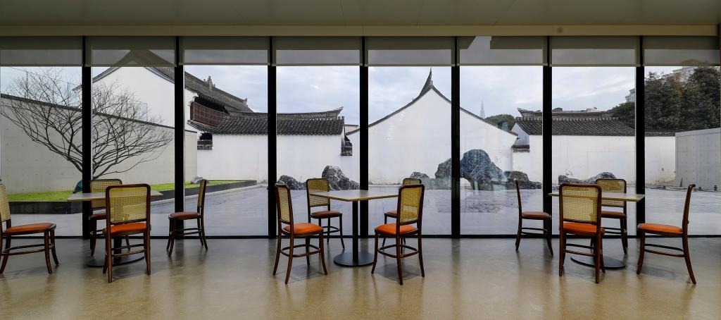 孑民图书馆一楼的休闲空间以现代简约风格打造,木质桌椅搭配暖色灯光,营造出温馨雅致的氛围。游客可在此享用现磨咖啡、精致茶点与轻食简餐,透过全景落地窗,蔡元培故居古朴的山墙与图书馆外侧假山水景尽收眼底。空间巧妙融合了阅读休憩与观景功能,让人在品味咖啡香的同时,感受历史建筑与现代空间的诗意对话