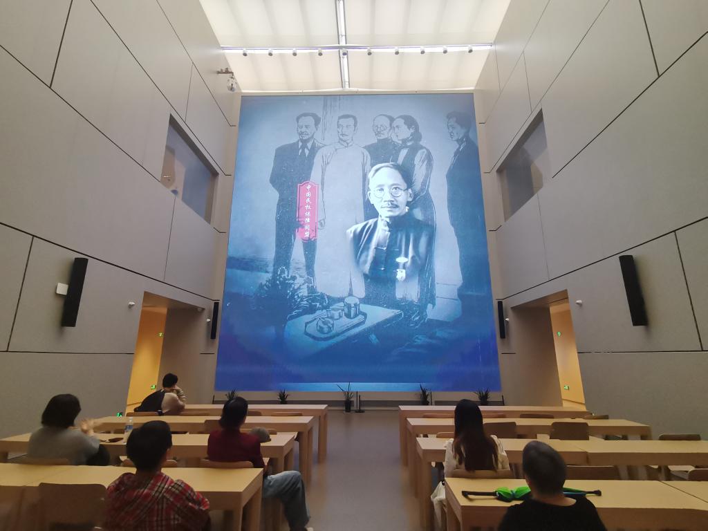 孑民图书馆一楼的元培学堂是一个多功能文化空间,配备高清巨幕显示屏,循环播放蔡元培专题纪录片。空间采用灵活布局,可快速切换为研学课堂、学术沙龙或小型会议模式,提供专业视听设备与个性化服务。木质阶梯座椅与暖色灯光营造出庄重而温馨的氛围,既满足知识传播需求,又延续了蔡元培"兼容并包"的教育理念