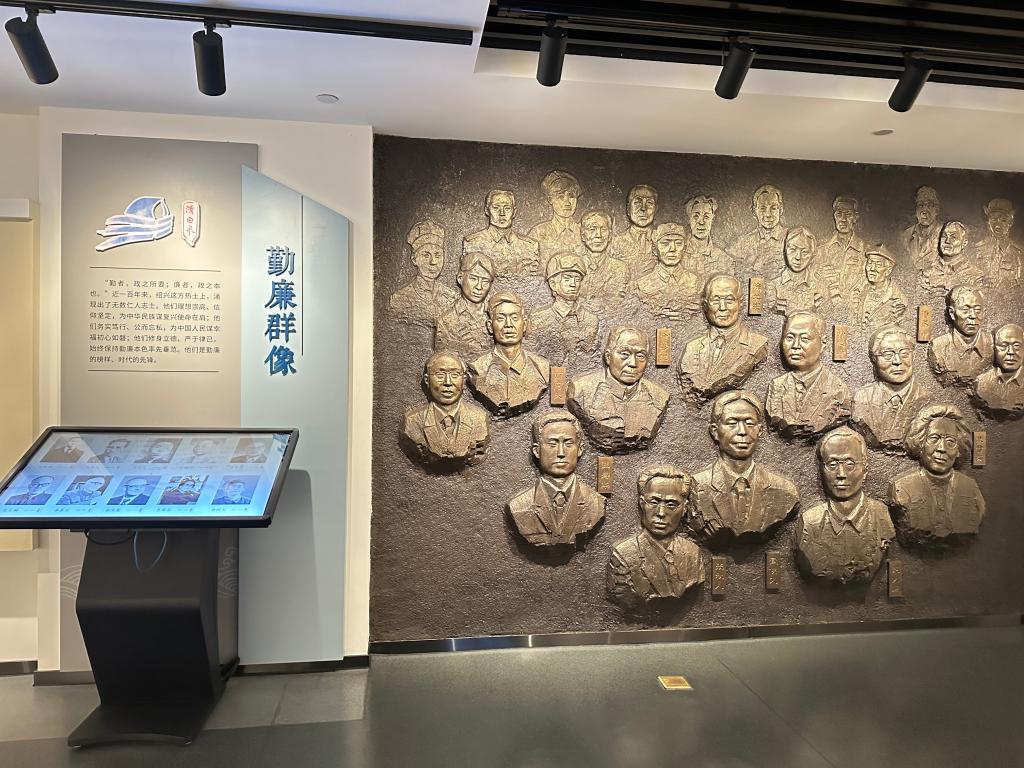 “勤廉群像”浮雕墙,以中国稀土之父——徐光宪,中国石油工业的创始人当代工矿泰斗——孙越崎,越剧表演艺术家——袁雪芬等九位勤廉代表人物为灵魂,浅浮雕围绕着工、农、兵、学、医、商等人物形象,涵盖了老、中、青,男、女等各行各业的人民群众,形成一个簇拥的集合体,旨在突出“勤廉”主题