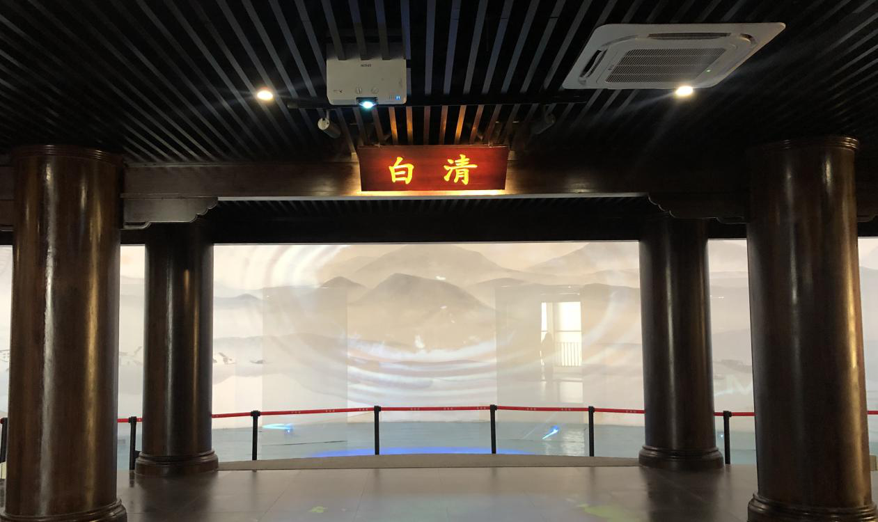 绍兴清廉馆序厅是以“清白堂”的建筑元素所设计,正前方挂有“清白”匾额。稽山鉴水的背景图,连绵盛开的莲花,寓意着绍兴是礼仪之邦、清廉之地