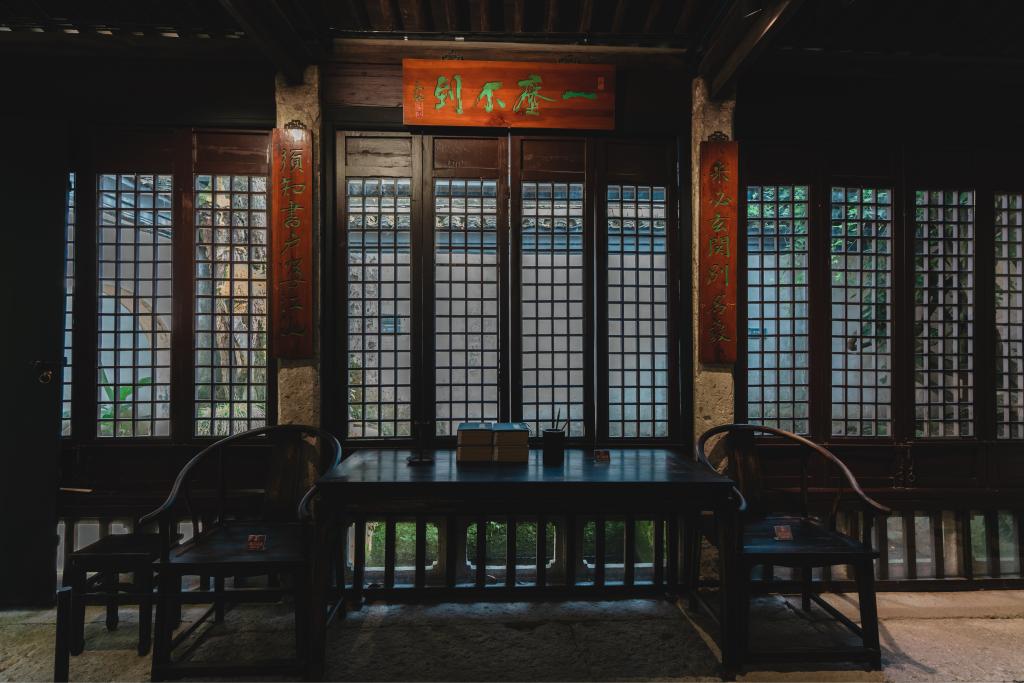 前门上方的匾额“洒翰斋”为徐渭手迹,他青少年在此习书作画。墙面挂着《墨葡萄图》,水墨淋漓,使中国画的特征得到了充分的表现,同时图上所题诗句“笔底明珠无处卖,闲抛闲掷野藤中”,更使人强烈地感受到他纵情但又不愿驯服的内心世界。两侧有吴昌硕篆书七言联“树角夕阳归邋马,花阴微雨写来禽。仲清仁兄正譌,安吉吴俊卿”。室内陈列了画案,文房四宝,明式书柜兼博古架,架上有仿古线装书及仿明代瓷杂若干。北墙悬挂了蒙...