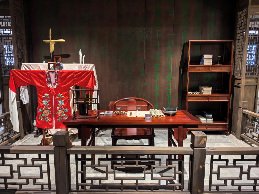 展厅模拟徐渭创作戏本所用的书房一景,旁置明代风格形制的戏服,生动还原当时的场景。徐渭自称“南腔北调人”,他在戏曲上的成就非常突出,创作了不拘一格、抒怀写愤的杂剧《四声猿》,掀起了明中后期杂剧创作的高潮;研究“士夫罕有留意”的宋元南戏,留下了中国古代戏曲史上唯一的一部南戏概括性著作《南词叙录》