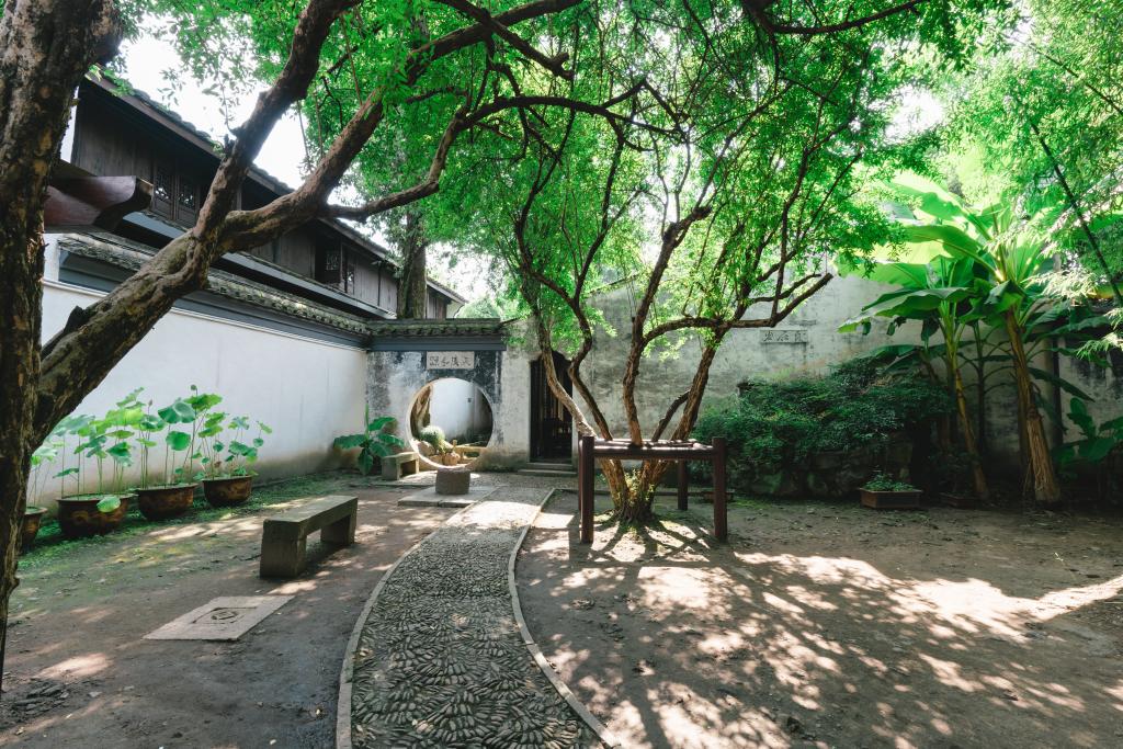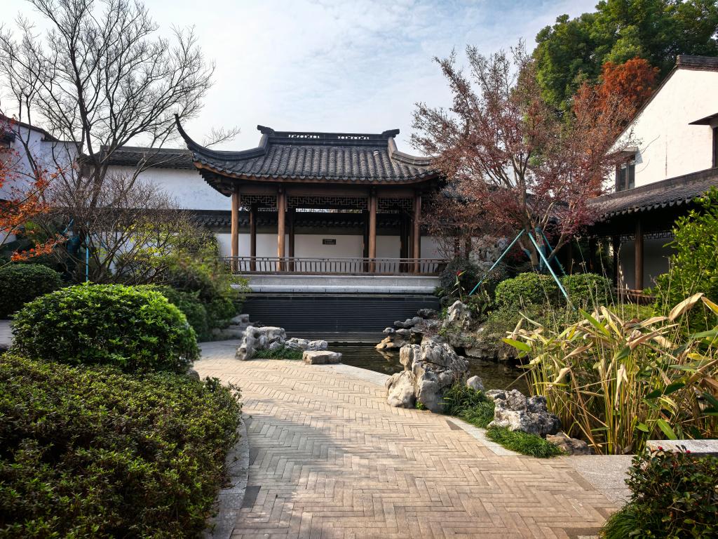 绍兴师爷馆后院的中式园林景观,飞檐翘角的亭子、白墙黛瓦的建筑,搭配假山、绿植、水池,营造出宁静雅致的氛围,让人感受中式古典韵味与闲适意境