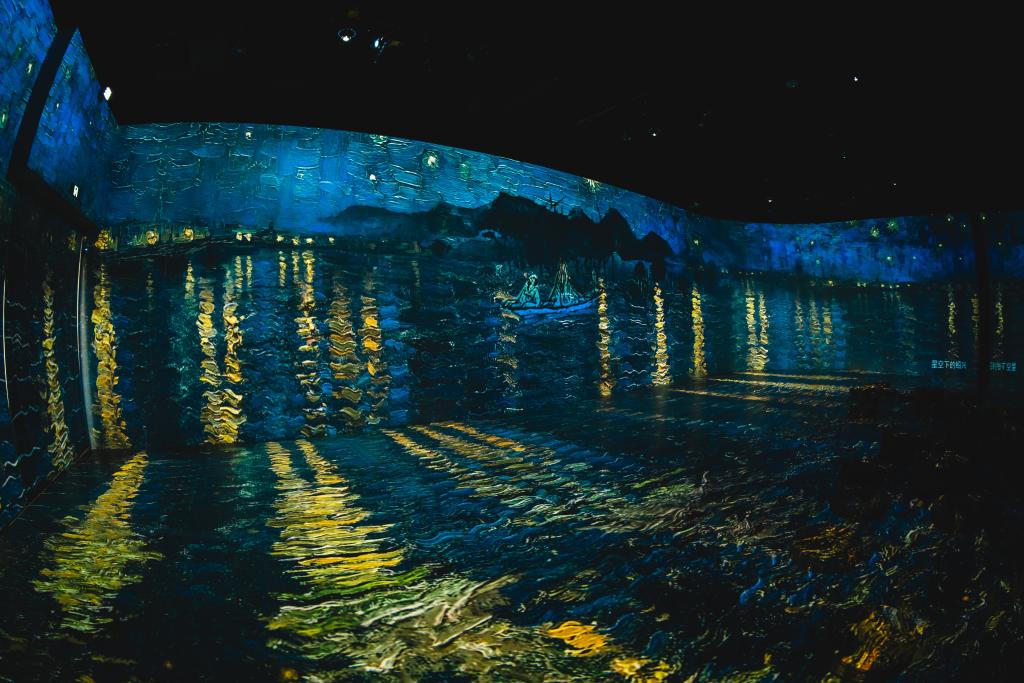 艺术馆的沉浸式数字厅,将徐渭和梵高共置一室。东方的“大写意”遇上西方“印象派”,两位生前寂寞死后荣耀的天才艺术家在此相遇,无论是“中国的梵高”还是“西方的徐渭”,这不约而同的“命运多舛”经历诠释了天才画家的诞生,让观众沉浸于徐渭狂放的山水和梵高静谧的星空中